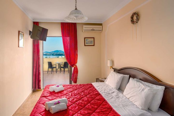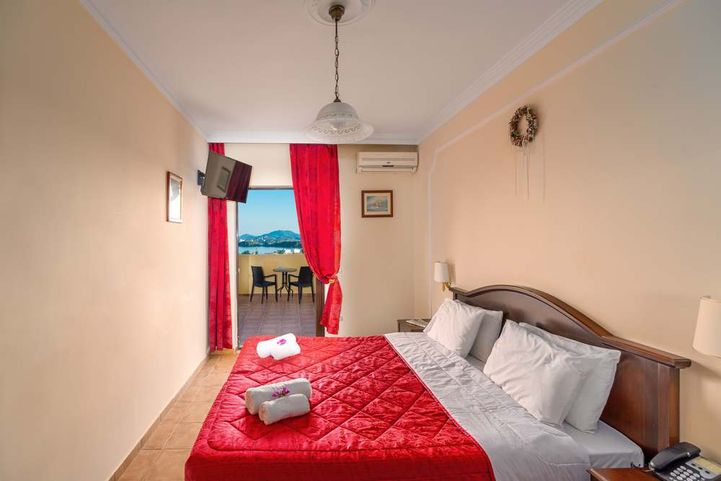 >Una composizione romantica con elementi dell'era d'oro di Corfu. Grande terrazza con viste panoramiche. Lussuosi mobili in legno in noce e sulle pareti della collezione dell'hotel.